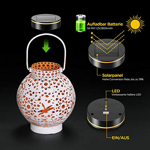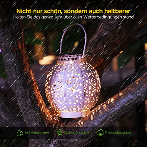 Langlebige Solarlaterne: Die Solarlaterne für außen besteht aus hochwertigem Metall mit rostfreier Oberfläche und ist IP65 wasserdicht und korrosionsbeständig. Die hängend Solarlampen ist mit einem haltbaren Griff ausgestattet, so dass Sie sie nicht nur auf die Tischplatte legen, sondern auch an einen Hirtenhaken hängen können.