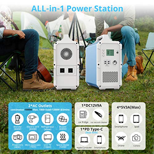 Multi-Ausgänge für verschiedene Anforderungen (2 * AC / 1 *Zigarettenanzünder / 1 * PD 45W Typ C / 4 * USB): AC220V-Steckdosen für die meisten Haushaltsgeräte bis 1000 W wie Fernseher, CPAP, Drohne. 12V9A Auto-Zigarettenanzünder für autogetriebene Geräte wie Minikühlschrank, Auto-Staubsauger, 1 * QC PD 45W USB-C für Laptop MacBook Air / Pro & USB-C iPad, 4 * 5V 3A USB für Telefon, Kamera, Lüfter.Dieses tragbare Solarkraftwerk bietet ausreichend Strom für den Außenbereich und den Innenbereich